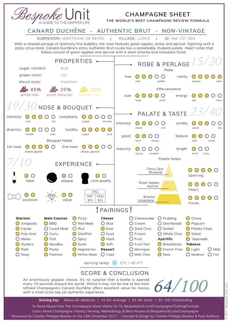 In the following review, you will discover Canard-Duchêne Authentic Brut. By using the Bespoke Unit Champagne Sheet, we will uncover its robe, aromas and flavours while taking into account its value for money and the overall experience.
