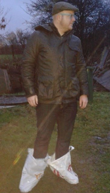 Lastly, you can carry a simple plastic bag(s) with you to cover your overshoes when you have taken them off while inside. They fold up fairly small and fit into most overcoat pockets for storage.