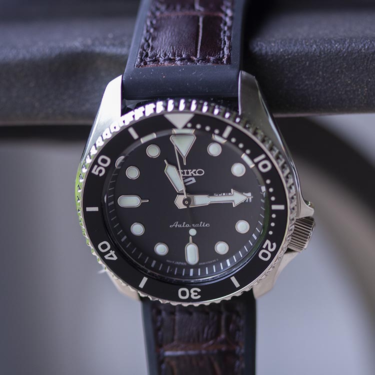 One of the hallmarks of this SRPE21, and of many watches within the 5 Sports Specialist subcollection, is an interesting “fused” style of strap. In this case, the band is composed of black silicone with a brown, stitched alligator insert.